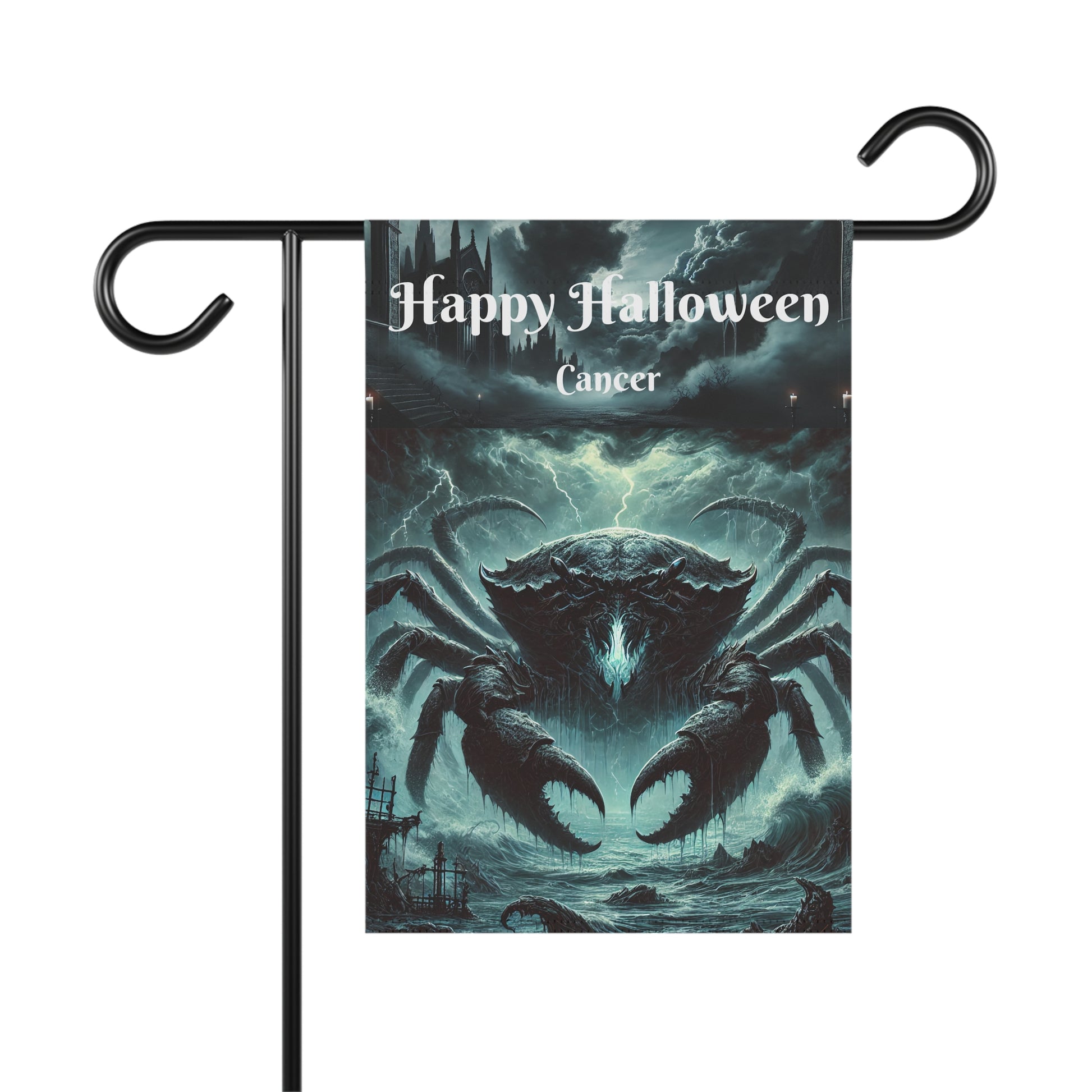 Dive into the depths of mystery this Halloween with a chilling, gothic interpretation of the Cancer zodiac sign. This eerie banner features a massive, menacing crab emerging from dark, stormy waters, its sharp claws and glowing eyes creating an ominous presence. The swirling mist and crashing waves around the crab add a haunting atmosphere, perfectly capturing the emotional and protective nature of Cancer in a spooky, captivating design. Ideal for adding a unique astrological twist to your Halloween décor, this banner brings the mystical and the macabre together in a stunning display. Crafted from durable, weather-resistant fabric, this banner is perfect for outdoor use in your garden or porch but can also be displayed indoors to create a chilling ambiance. Whether you’re decorating for a Halloween party or simply want to celebrate the spooky season with a zodiac touch, this Cancer-themed banner will add a mysterious and gothic vibe to your setup. Embrace the deep, emotional power of Cancer with a banner that blends haunting beauty and astrological symbolism for a truly unique Halloween display. .: 100% Poly poplin-canvas fabric .: One size 12'' × 18'' .: Same design printed on both sides; flag flipped over long edge (intended for designs in a vertical orientation) .: Black inside lining .: Features sleeve at top .: Pole, hooks, or fasteners are not included